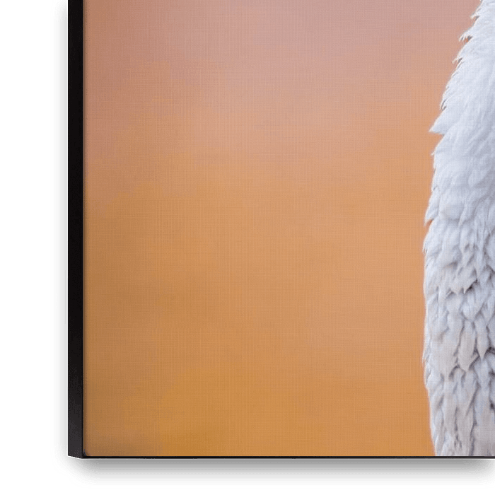 Bestelle dieses Vögel Wandbild Nahaufnahme eines Flamingos in warmem Licht von Triki Photography als Reproduktion auf Leinwand, Alu-Dibond, als Poster, Fototapete, ArtFrame oder Acrylglasbild, maßgefertigt in höchster Qualität.