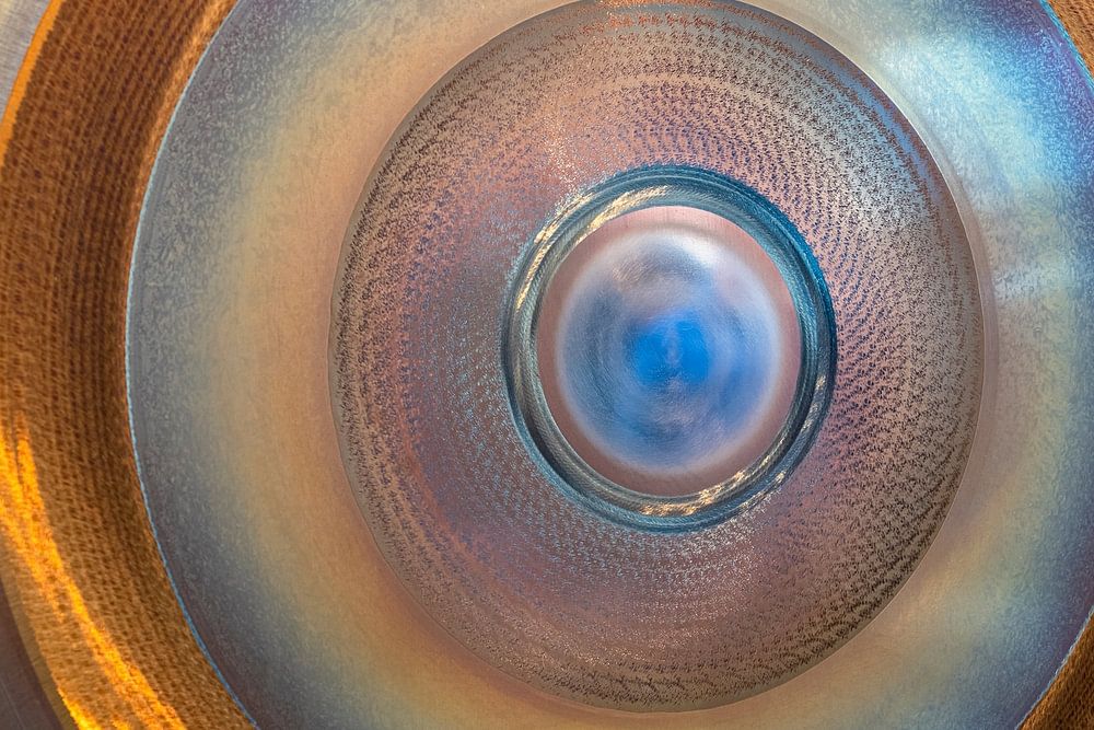 Vollformatige abstrakte Nahaufnahme eines farbenfrohen metallischen asiatischen Gongs