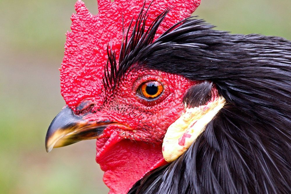 Nahaufnahme eines schwarzen Hahns mit rotem Kamm
