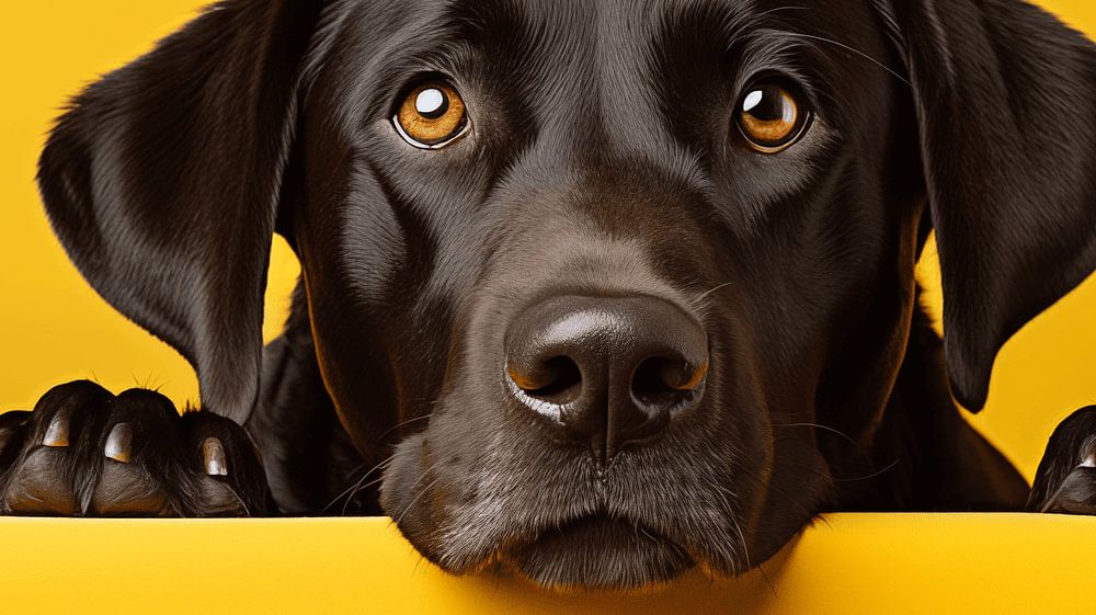Nahaufnahme eines schwarzen Labrador Retrievers vor einem leuchtend gelben Hintergrund.