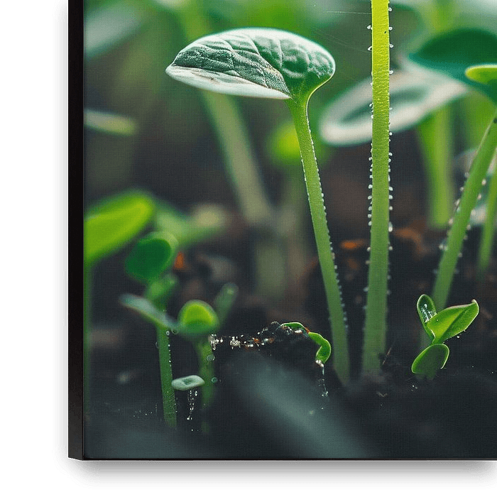 Diese atemberaubende Nahaufnahme zeigt die zarte Schönheit des knospenden Lebens. Das zarte Grün der jungen Pflanzen steht in schönem Kontrast zu der satten, dunklen Erde, der sie entspringen. Das Licht fängt die Details jedes Blattes und jeder Ader ein und schafft ein Gefühl von Staunen und Ehrfurcht. Holen Sie sich die Gelassenheit…