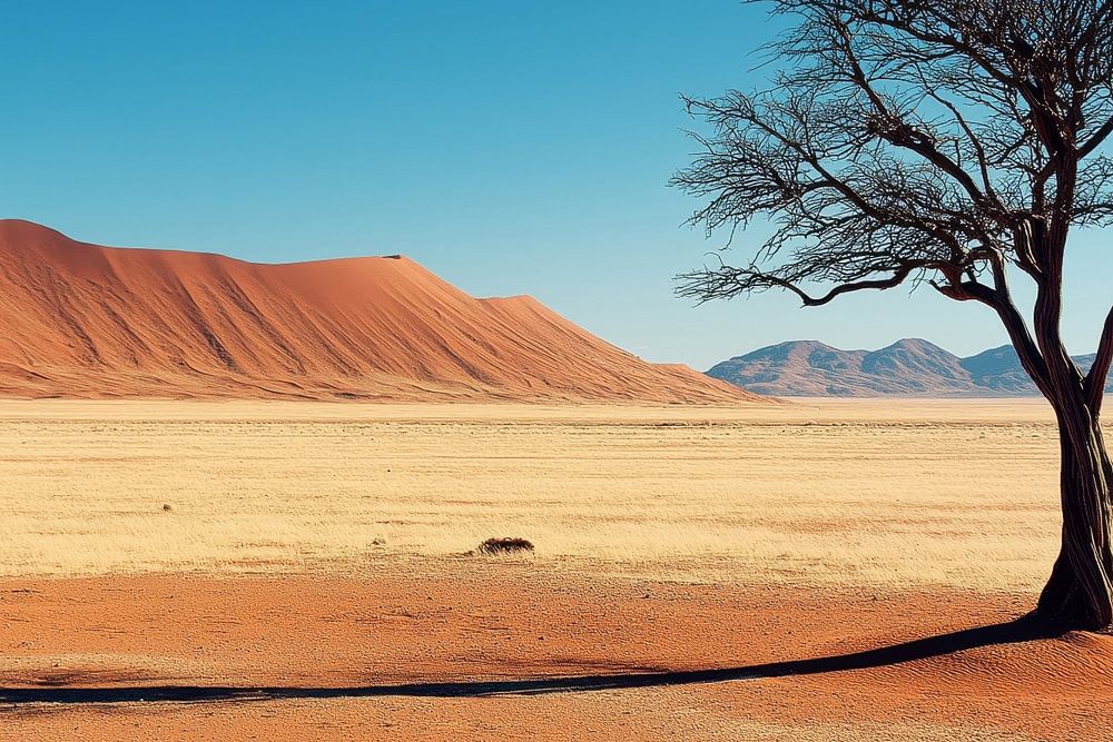 Ein einsamer Baum in einer Wüste in Namibia im Stil einer Fotografie.