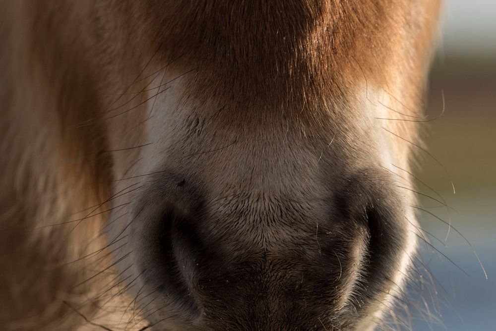 Nahaufnahme der Nase eines Fjordpferdes im Naturschutzgebiet Slikken van Flakkee in der Provinz Südholland, auf der Insel Goeree-Overflakkee in den Niederlanden. Das Fjordpferd ist eine Pferderasse aus Norwegen. Sie ist eine der ältesten und reinsten Rassen der Welt.
