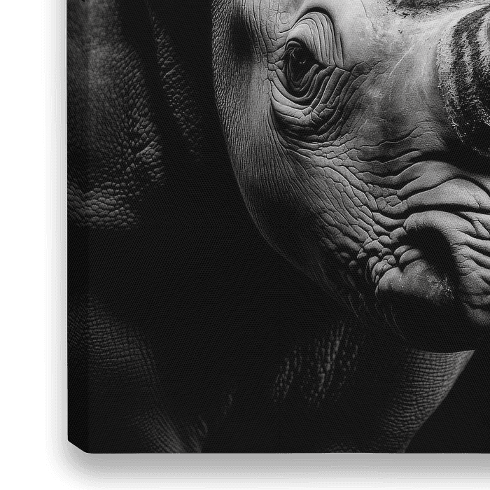 In imposanter Anmut begegnet einem das majestätische Rhinozeros, dessen kraftvolle Präsenz und markante Hornstruktur uns in den Bann ziehen. Die kontrastreiche Schwarz-Weiß-Darstellung verstärkt die Tiefe und Textur, perfekt geeignet als auffälliger Akzent im Wohnzimmer, wo sie Gespräche anregen und Staunen hervorrufen kann.