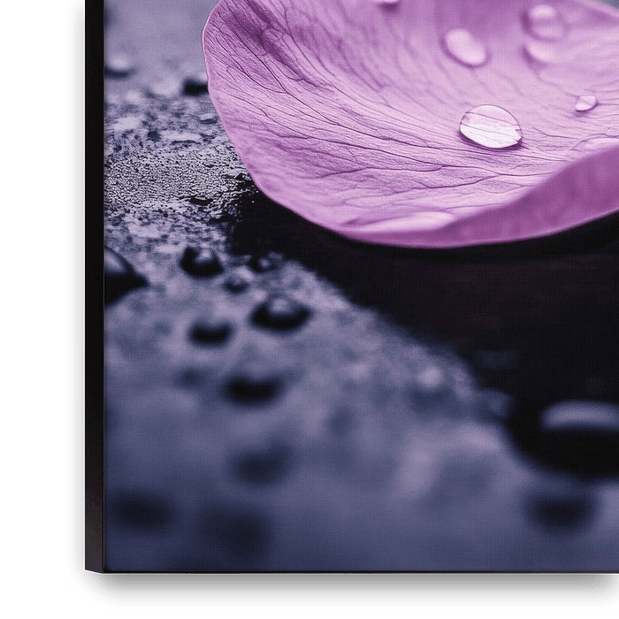 Ein zarter, lila Blütenblatt liegt sanft auf einer glitschigen Oberfläche, umgeben von funkelnden Wassertropfen, die wie kleine Edelsteine wirken. Die sanfte Farbpalette und die filigrane Textur verleihen jedem Raum eine beruhigende Eleganz. Ideal für das Schlafzimmer, um eine entspannende Atmosphäre zu schaffen, die zum Träumen anregt.