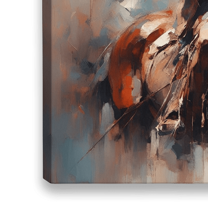 Ein Indianerhäuptling mit Federkopfschmuck sitzt rittlings auf einem majestätischen braunen Pferd. Sowohl das Pferd als auch der Reiter sind vor einem Hintergrund ausdrucksstarker Pinselstriche dargestellt, die Bewegung und die Rauheit der natürlichen Umgebung andeuten.