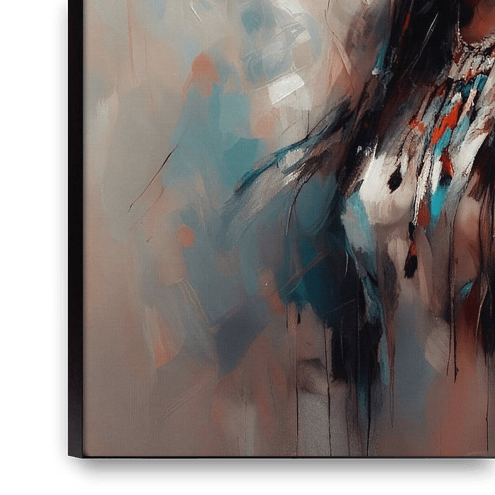 Eine Person mit indigener Kleidung, darunter ein gefiederter Kopfschmuck, ist mit einem intensiven und nachdenklichen Ausdruck dargestellt. Der Hintergrund ist abstrakt mit breiten Strichen in neutralen Tönen, die die Aufmerksamkeit auf das Motiv lenken.
