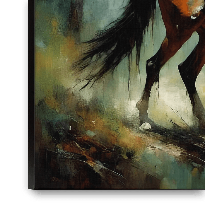 Ein indianischer Krieger ist auf einem Pferd inmitten einer bewaldeten Landschaft abgebildet. Er trägt traditionelle Kleidung und einen mit Federn geschmückten Kopfschmuck, und man spürt, wie sie sich durch das gedämpfte Licht des Waldes bewegen.