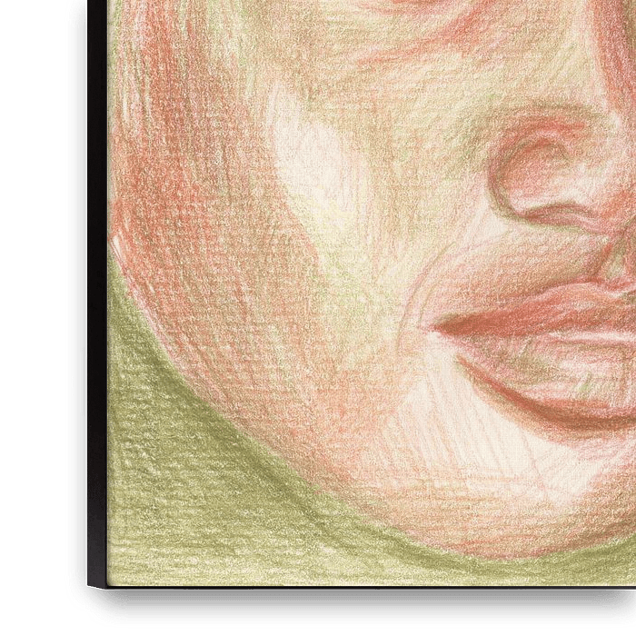Porträt einer Frau. Die Zeichnung besteht aus Buntstift in Grün- und Brauntönen. Das Gesicht strahlt Ruhe und Neugier aus. Aber es erzählt jedem Zuschauer seine eigene Geschichte.