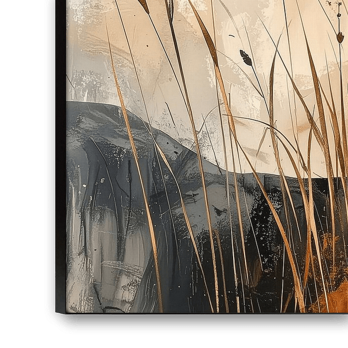 Es zeigt Schilf- oder Grasbüschel in einer neutralen Farbpalette aus gedämpften Cremetönen, Beige- und Brauntönen und dunkelgrauen oder schwarzen Akzenten.