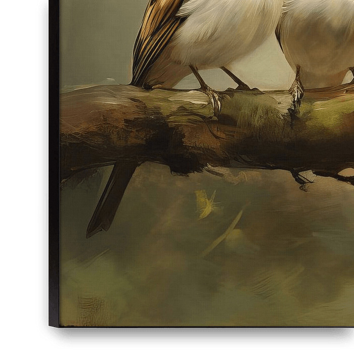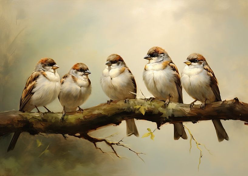 Natural Sparrow Art - Mit warmen Taupe- und Elfenbeintönen erweckt dieses Gemälde eine Gruppe von Spatzen zum Leben, die sich auf einem stillen Ast ausruhen. Ihr flaumiges Gefieder und ihre Mimik sind fast greifbar dargestellt und verleihen der Szene ein ruhiges und natürliches Aussehen, das jeden Raum mit einer weichen, ländlichen…