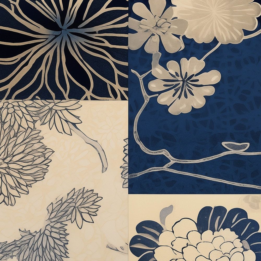 Das Kunstwerk zeigt eine Collage aus verschiedenen Mustern und Designs, von denen jedes seinen eigenen Charakter hat, aber durch ein begrenztes Farbschema aus Blau, Schwarz und Beige zusammengebracht wird.