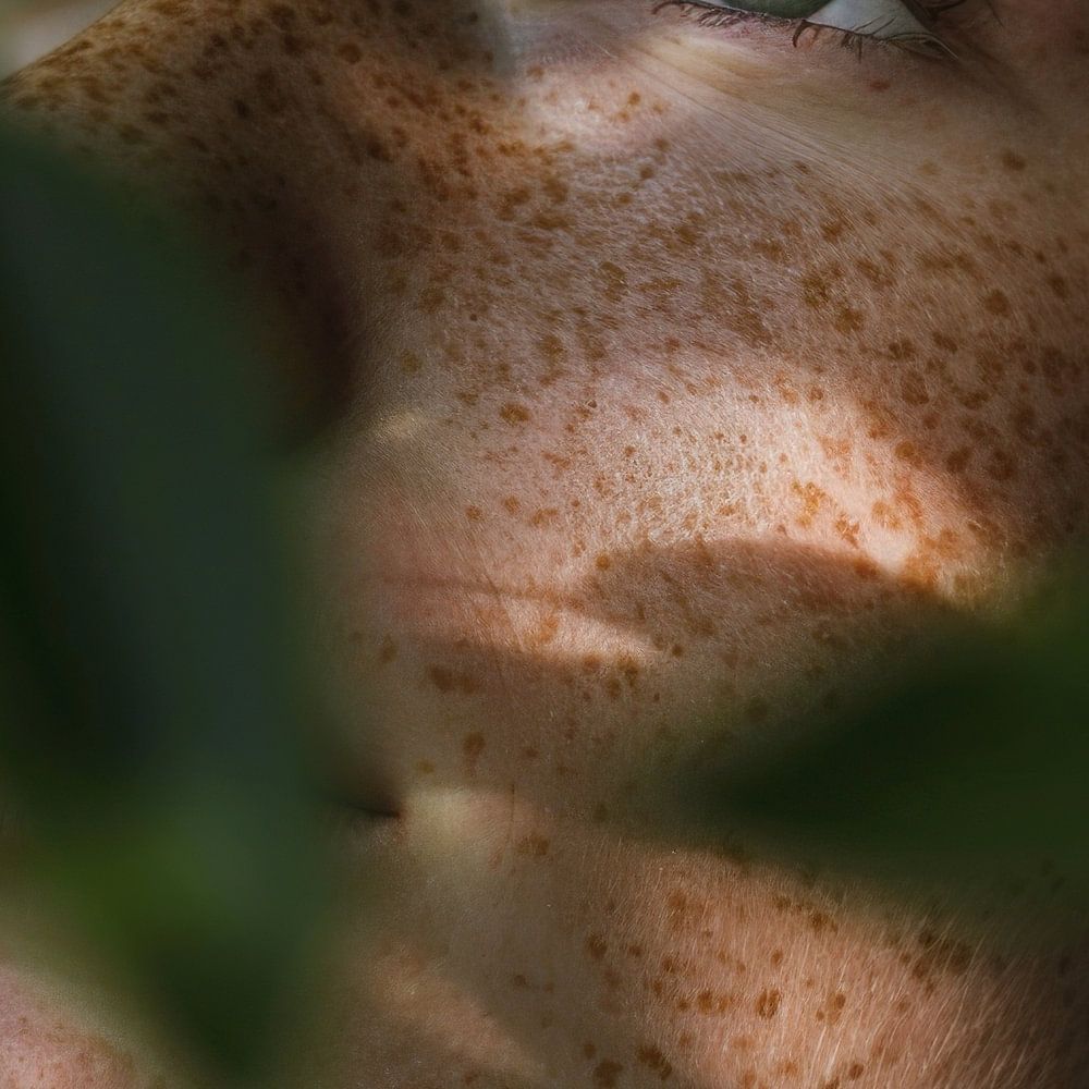 Dieses bezaubernde Portrait einer Frau zeigt sie, teilweise verborgen hinter grünem Laub, mit sanftem Lichtspiel auf ihrem Gesicht. Die Sommersprossen verleihen ihrer Haut eine einzigartige Textur und Tiefe, während ihre Augen durch die Blätter hindurch strahlen. Ideal für Liebhaber von natürlicher und authentischer Fotografie, die die Schönheit und den Frieden der Natur in ihren Kunstwerken schätzen.