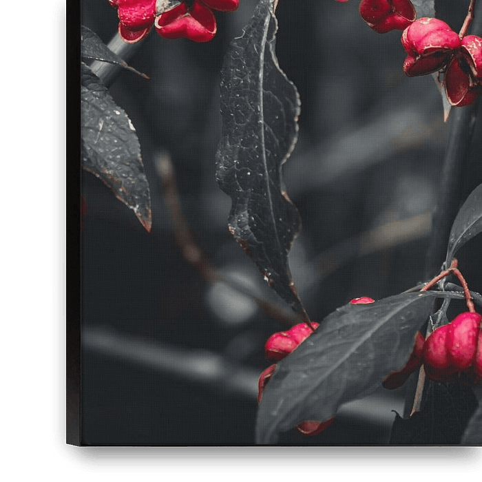 leuchtendes rotes Pfaffenhütchen auf dunklem Hintergrund.