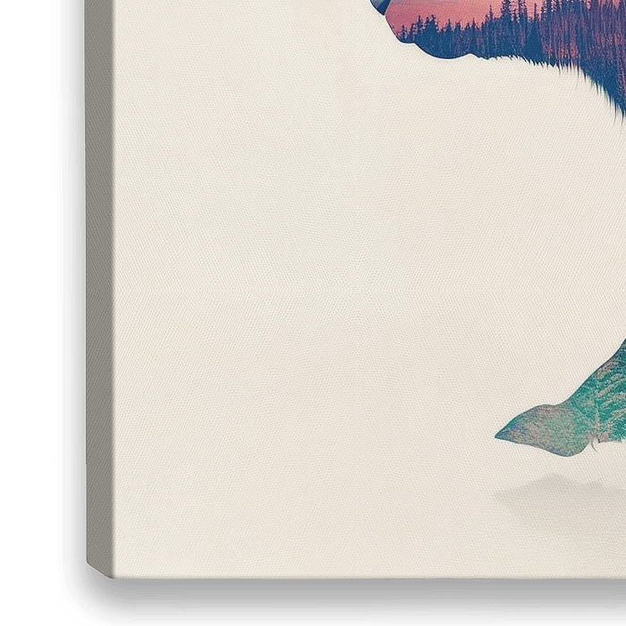 Ein faszinierendes Zusammenspiel aus Natur und Tier: Der Hase tanzt durch majestätische Berge und üppige Wälder, seine Silhouette von lebendigen Farben durchzogen. Dieses künstlerische Meisterwerk bringt Lebensfreude und eine harmonische Verbindung zur Natur in jedes Wohnzimmer, während es zugleich als inspirierender Blickfang dient.