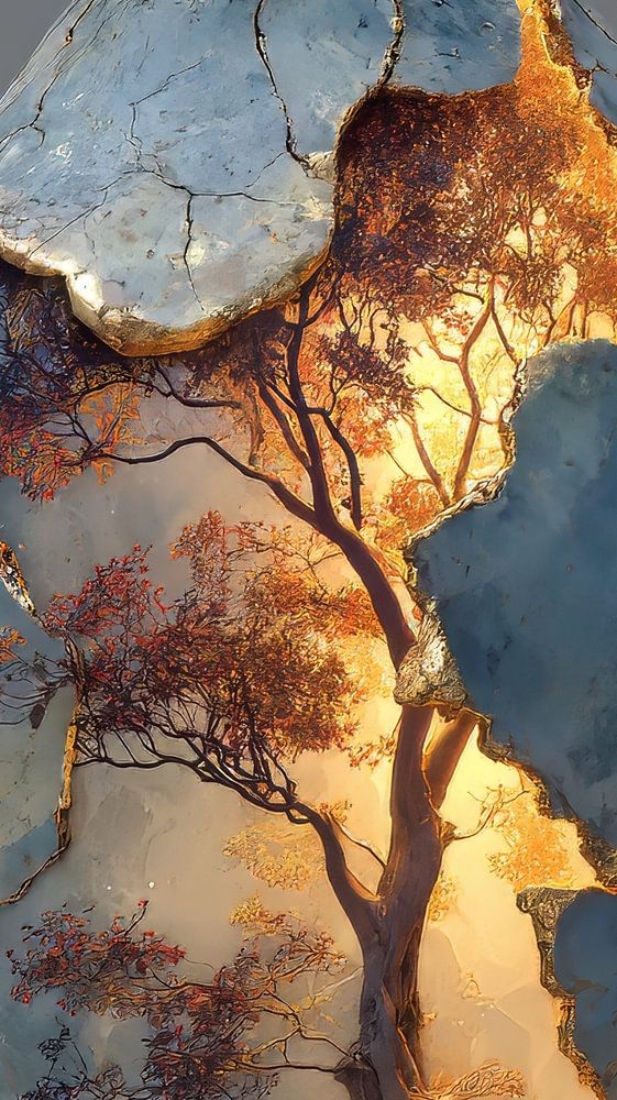 Dieses Gemälde erzählt eine Geschichte von Zerbrechlichkeit und Stärke. Hinter der verwitterten, rissigen Oberfläche eines steinernen Gefäßes verbirgt sich eine Welt: ein majestätischer Baum, der in warmes Sonnenlicht getaucht ist und seine Wurzeln fest verankert, als Symbol für Leben, Wachstum und Widerstandsfähigkeit.