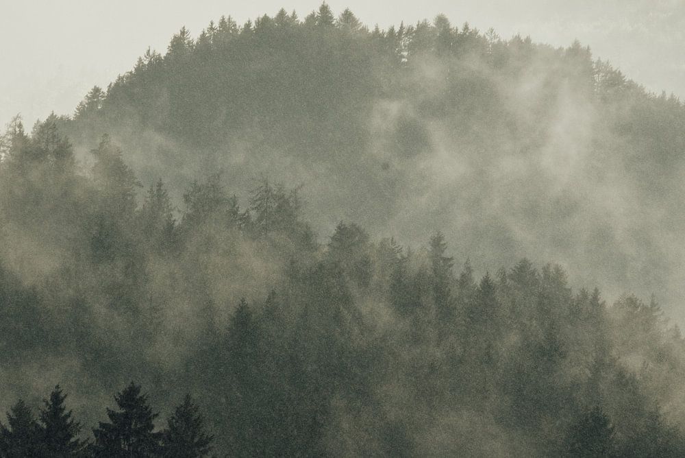 Dichter Nebel hängt wie ein Schleier über den österreichischen Bergen und Wäldern und verdeckt vorübergehend die Sicht auf die Landschaft. Kiefern erheben sich stattlich aus dem Dunst, ihre Silhouetten sind vage und vielschichtig, als würden sie sich in der feuchten Luft auflösen. Die Farben sind gedämpft - tiefe Grüntöne, Grautöne und das Braun der Baumstämme - aber gerade deshalb intensiv. Kein Sonnenlicht, keine Blendung, nur diffuses Licht, das allem eine ruhige, fast feuchte Atmosphäre verleiht. Die Berge im Hintergrund verschwinden in Weiß, wodurch die Tiefe des Bildes verschwimmt und ein beklemmendes Gefühl der Isolation entsteht.