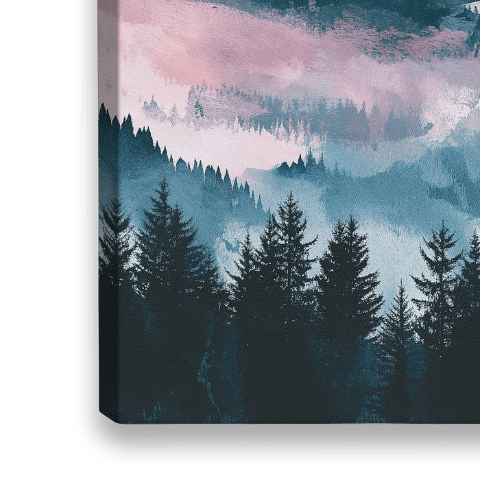 Eine stimmungsvolle digitale Komposition, in der majestätische Berglandschaften in einem harmonischen Zusammenspiel von Türkis- und Rosatönen dargestellt werden. Die Schichtung nebliger Berge, umgeben von Piniensilhouetten, schafft eine verträumte Atmosphäre, die zwischen Realität und Fantasie balanciert. Der sanfte Farbübergang und die…