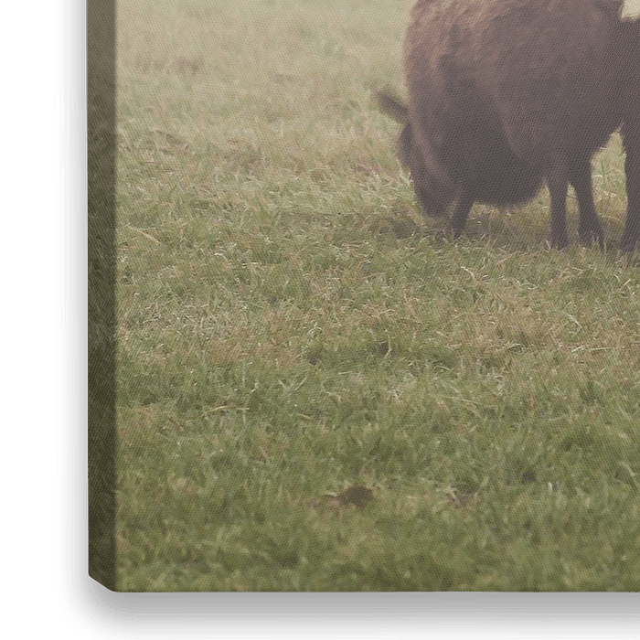eine Wiese mit braunen Schafen, früh an einem Wintermorgen, wo die Sicht durch den dichten Nebel eingeschränkt ist