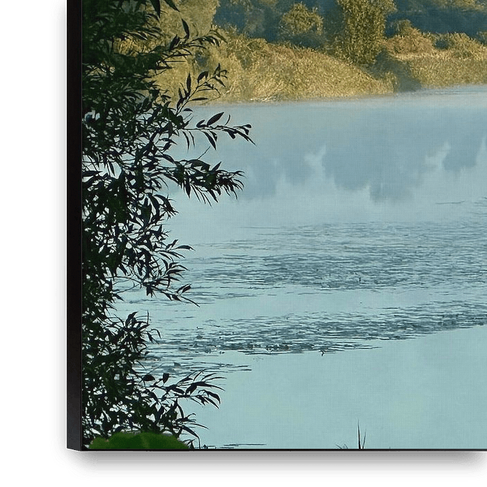 Dieses Morgenmotiv zeigt einen sanften Fluss, der sich durch eine nebelverhangene Landschaft windet: Weißer Dunst liegt wie ein Schleier über dem Wasser, umrahmt von grünen Uferbäumen, Schilf und leuchtenden Seerosen. Der Himmel übergeht in Pastelltönen von Blau zu Gelb, spiegelt sich zart auf der Oberfläche und erzeugt eine traumhafte…