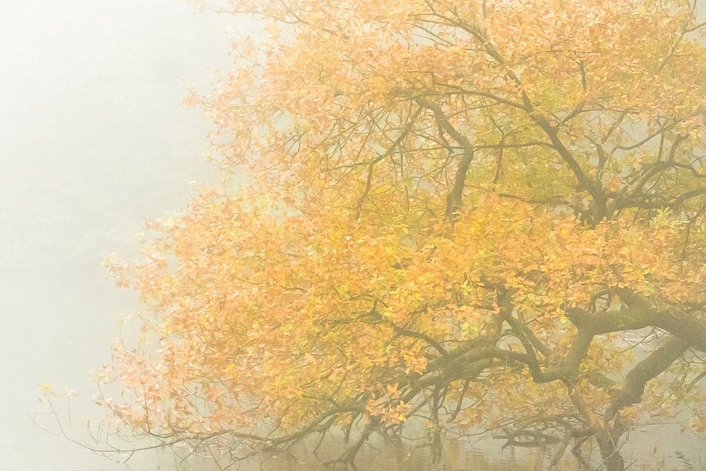 An einem nebligen Morgen auf dem Veluwezoom entdeckte ich diese markante Eiche, die über dem Wasser hängt. Der Baum sticht mit seinen schönen gelben Herbstblättern hervor, und der Nebel macht den Hintergrund ruhig. Ein weiteres schönes Detail ist, dass ein paar Blässhühner um den Baum herumschwimmen.