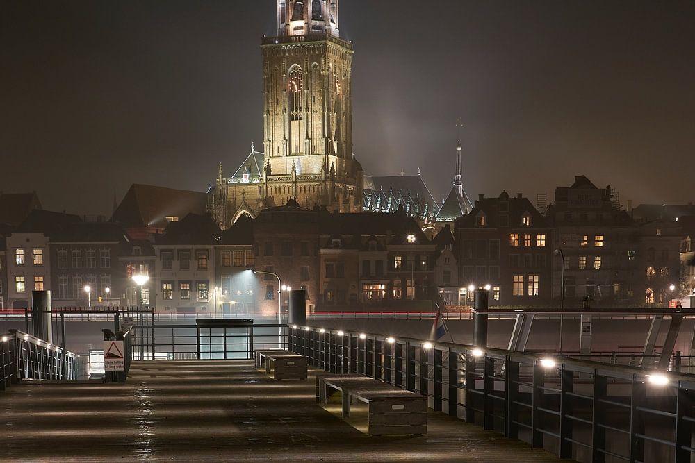 Die Skyline von Deventer von der Fußgänger- und Fahrradfähre in De Worp über die IJssel gesehen. Am Ende des Abends wurde es in Deventer dunstig. Der Dunst lichtete sich und wird vom Turm der Lebuinuskirche beleuchtet.
