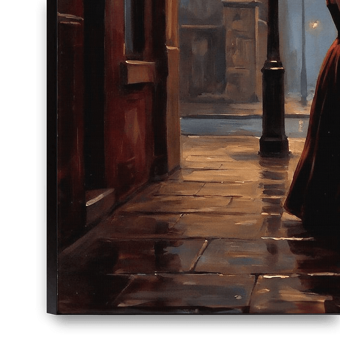 Dieses Gemälde fängt einen flüchtigen Moment der stillen Selbstbeobachtung vor dem Hintergrund einer nebligen, regennassen Straße in der Abend- oder Morgendämmerung ein. Als Künstlerin wollte ich ein Gefühl der Einsamkeit und des Geheimnisses hervorrufen und das Gewöhnliche mit dem Poetischen verbinden. Den Mittelpunkt der Szene bildet…