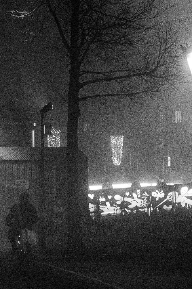 Diese Schwarz-Weiß-Fotografie fängt einen nebligen Abend in Amsterdam ein, der eine stimmungsvolle und atmosphärische Szene bietet. Eine alte Straßenlaterne leuchtet sanft, beleuchtet den umgebenden Nebel und wirft ein warmes Licht in die kalte Luft. Auf der linken Seite fährt ein einsamer Radfahrer durch den Nebel, was der ruhigen, schwach beleuchteten Straße ein menschliches Element hinzufügt.