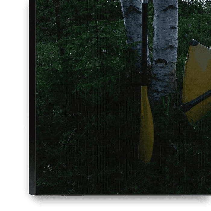 Zwei kanadische Kanus am Ufer eines schwedischen Sees. Die Sonne ist bereits untergegangen und der Nebel zieht langsam über den See.