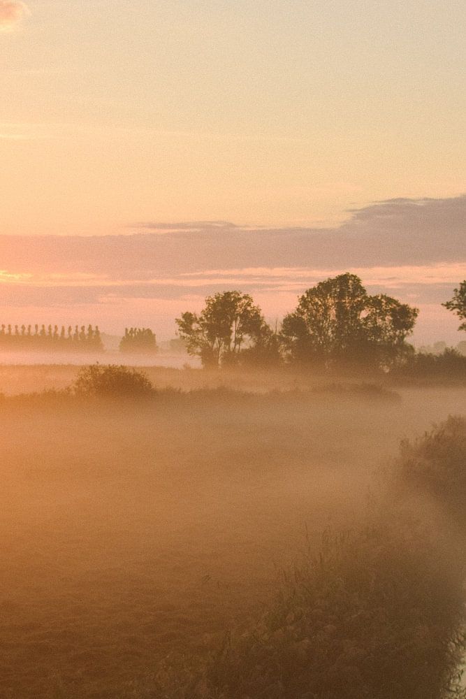 Ein sommerlicher Sonnenaufgang im August. Der Nebel legt sich langsam wie eine Decke über die Wiesen von Kampen, Overijssel