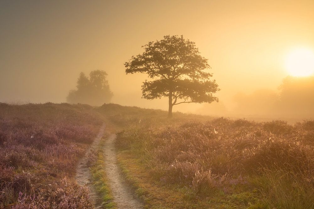 Die Kombination aus der blühenden Heide, dem Nebel und dem aufgehenden Sonnenlicht macht diese Szene besonders eindrucksvoll. Das Bild fängt nicht nur die Schönheit der Natur ein, sondern auch das Gefühl der Stille und Ruhe, das den frühen Morgen kennzeichnet. Hier wird das Wesen der Landschaft von Drenthe lebendig: weite Heidelandschaften, einsame Bäume und die Licht- und Nebelschichten, die sich je nach Sonnenstand verändern.