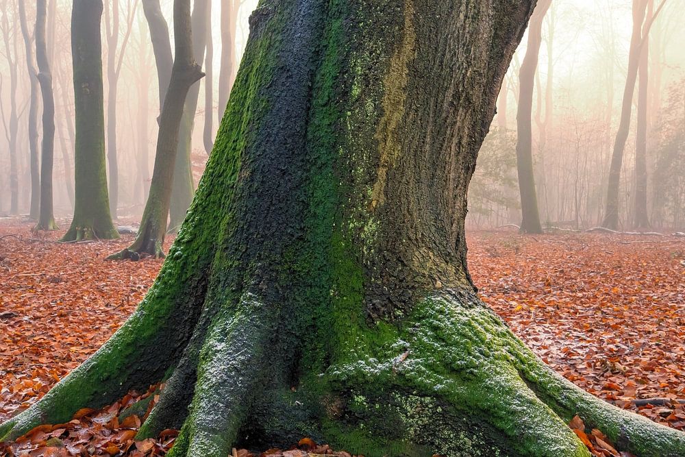 Buchenwald an einem nebligen Wintermorgen mit etwas Schnee auf dem Waldboden des Speulderbos im Naturschutzgebiet Veluwe. Der Waldboden ist mit braunen, gefallenen Blättern bedeckt und der Pfad verschwindet in der Ferne. Der Nebel verleiht dem Wald eine trostlose und muffige Atmosphäre.