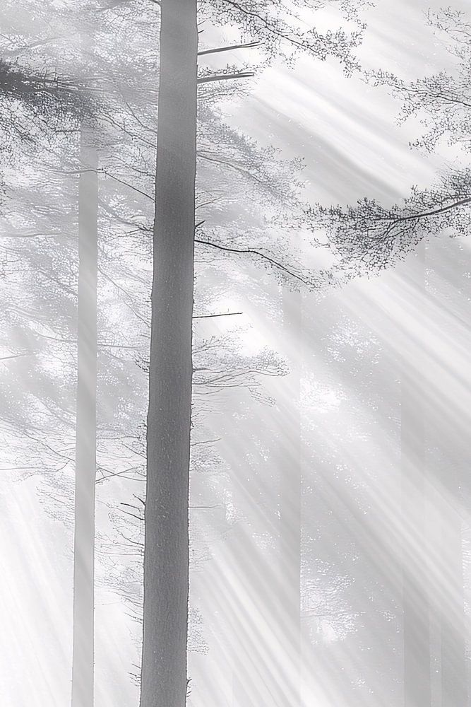 Dieses heitere Motiv zeigt einen nebligen Wald mit hohen, stattlichen Bäumen, die von sanften Sonnenstrahlen beleuchtet werden, die durch den Dunst scheinen. Seine monochromen Farben und sein beruhigender Look machen es zu einem perfekten Kunstwerk für Räume, die Ruhe und Einfachheit ausstrahlen. Dieses Bild ist ideal für ein Büro oder ein Schlafzimmer und schafft eine friedliche Atmosphäre mit einem Hauch von Geheimnis. Die subtilen Lichtstrahlen verleihen dem Bild Tiefe und Dynamik, so dass es scheint, als stünden Sie selbst im stillen Wald, umgeben von Natur und Stille.