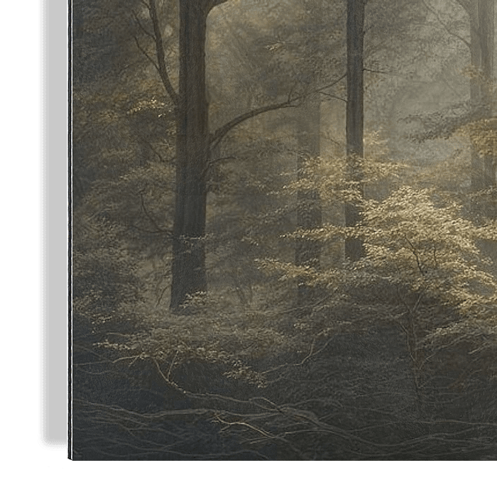 Misty Forest - Das Gemälde zeigt einen ruhigen Waldsee im sanften Morgenlicht, wo die Lichtstrahlen subtil durch die hohen Bäume brechen und einen mystischen Nebel umarmen. Die verwendeten Farben sind eine Symphonie aus warmen Erdtönen, die durch den goldenen Schimmer des gefilterten Sonnenlichts noch akzentuiert werden.