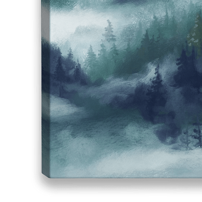 Mystischer, nebliger Wald mit in Blau- und Grüntönen gemalten Kiefern. Dieses Kunstwerk wurde mit digitaler Ölfarbe auf einem Zeichentablett erstellt. Eine schöne Komposition in einem realistischen Stil.