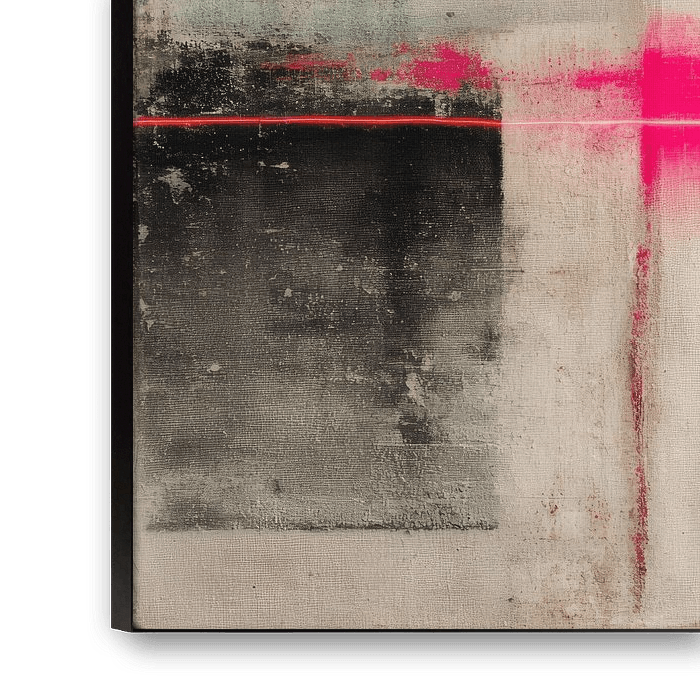 Das Werk kombiniert natürliche Unvollkommenheit mit einer modernen, urbanen Note. Das Gleichgewicht zwischen grauem Beige, verwittertem Schwarz und dem leuchtenden Neon-Pink macht es sowohl minimalistisch als auch auffällig.