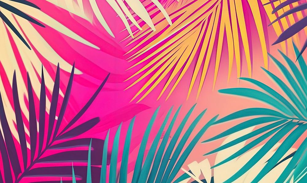 Die Palette ist kühn, mit Neontönen in Rosa, Gelb und verschiedenen Blau- und Grüntönen, die kontrastieren und dennoch harmonieren, um ein visuell ansprechendes Ganzes zu schaffen. Die Blätter sind grafisch gestaltet und bieten mit ihren scharfen Linien und klaren Konturen eine moderne und dynamische Interpretation der tropischen Flora.
