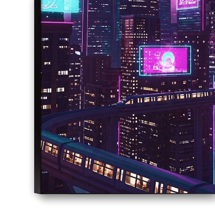 Eine lebendige retro-futuristische Stadtlandschaft in Vaporwave-Farbtönen von Pink und Cyan, inspiriert von der Science-Fiction-Kunst der 80er Jahre. Manuell verbessert für Glühen und Farbbalance
