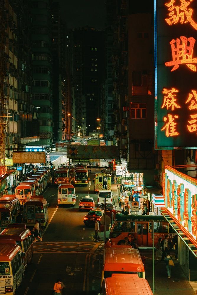 Das Bild fängt die lebendige Atmosphäre einer Straßenkreuzung in Hongkong bei Nacht ein, geprägt von den leuchtenden Neonreklamen in chinesischen Schriftzeichen und den markanten roten Minibussen. Die Szene dokumentiert das pulsierende Nachtleben einer Großstadt, in der Verkehr, Architektur und Farben miteinander verschmelzen. Die Straße ist gefüllt mit Stadtbussen, Fußgängern und beleuchteten Werbeschildern, die dem Bild Energie und Tiefe verleihen. Die enge Bebauung, die typischen Hochhäuser und das Spiel mit Licht und Schatten spiegeln die Vielseitigkeit des städtischen Lebens wider. Diese Fotografie eignet sich hervorragend als urbaner Wandschmuck, der die Dynamik und den Flair asiatischer Metropolen wiedergeben soll. Es spricht besonders Menschen an, die die Faszination für Großstädte, Nachtleben und moderne Architektur teilen. Das Werk verbindet Reisefotografie mit authentischer Lebendigkeit und macht Lust auf Entdeckungstouren durch das bunte Hongkong.