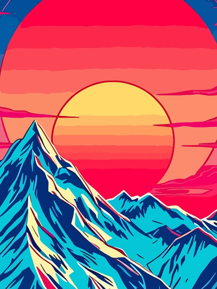 Eine abstrakte Landschaft mit Neonlichtern auf Berggipfeln bei einem dramatischen, farbenfrohen Sonnenuntergang oder Sonnenaufgang.