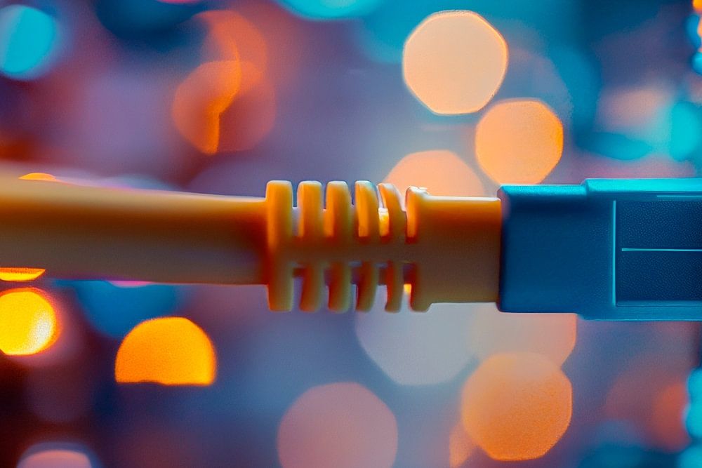 Eine faszinierende Verbindung von Technologie und Licht entfaltet sich in diesem Bild. Leuchtende Farben und die prachtvoll in Szene gesetzte Ethernet-Verbindung ziehen sofort die Aufmerksamkeit auf sich. Ideal für ein modernes Büro oder einen kreativen Arbeitsbereich, bringt es dynamische Energie und inspiriert zu innovativem Denken.