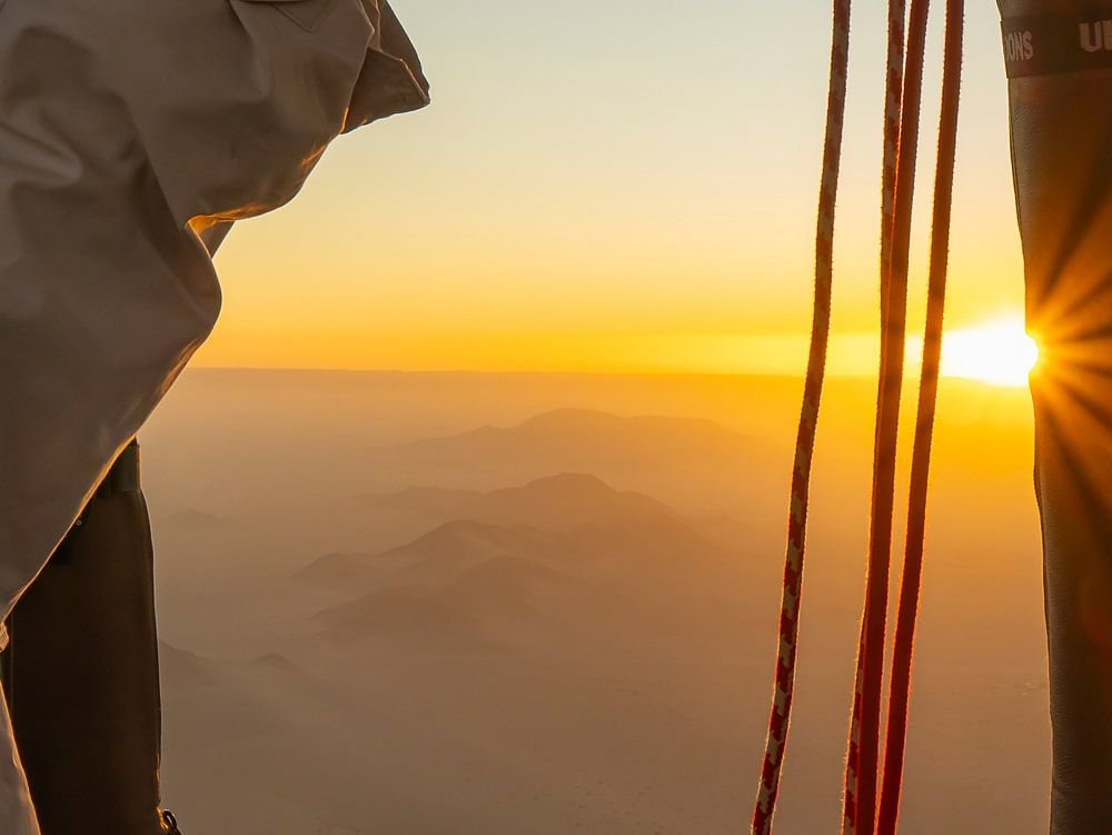 Die aufgehende Sonne in der Namibwüste vom Heißluftballon aus. Ein neuer Anfang und ein fantastischer Start in den Tag.