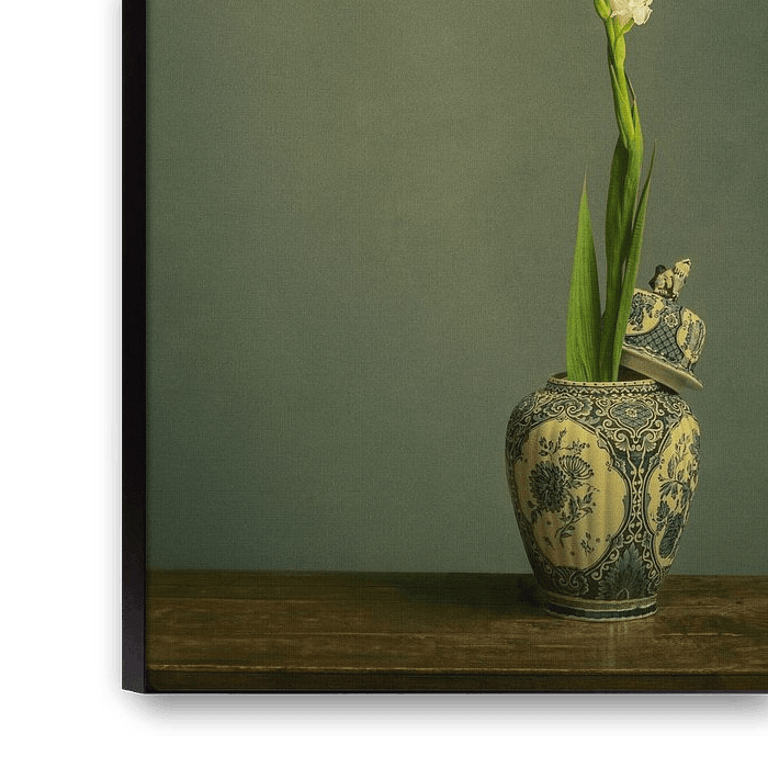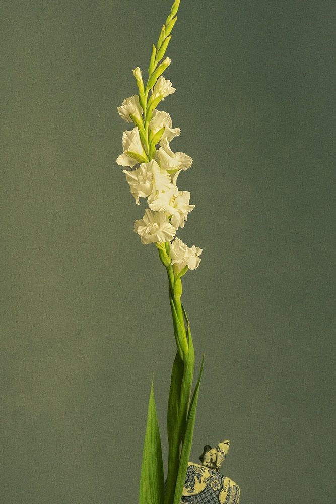 Stillleben mit Blumen (weiße Gladiolen) in einer delfterblauen Vase, aufgenommen im Atelier bei weichem Licht.