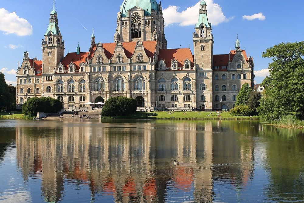 Das Neue Rathaus ist eingebettet in den zehn Hektar großen Maschpark am Südrand Hannovers, Die Vorderseite des Gebäudes liegt direkt am Maschteich.