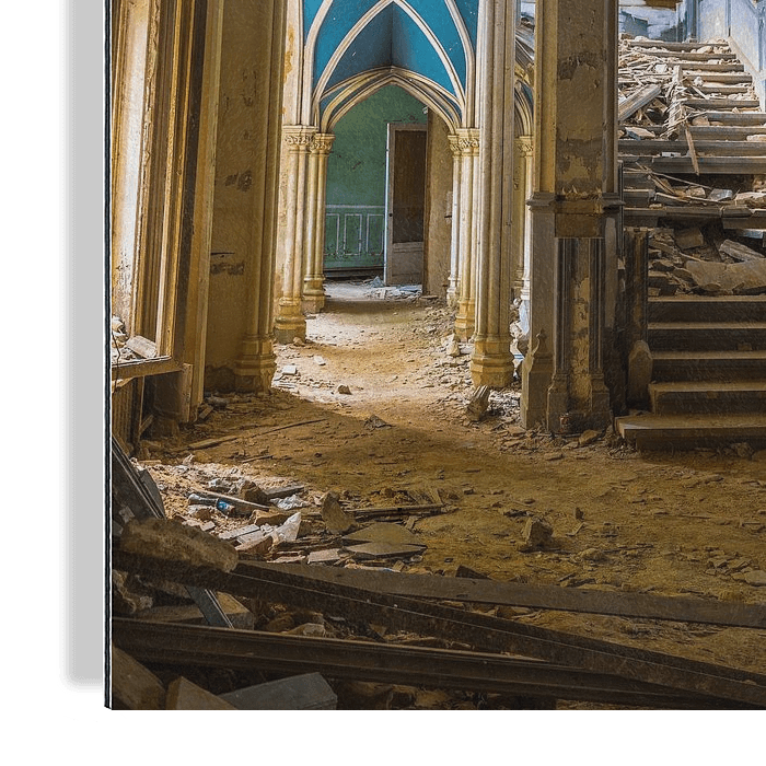 In einem verlassenen Schloss geht sie neugierig die ramponierte Treppe hinauf und streichelt die verfallene Wand. Der Kontrast zwischen dem verfallenen Schloss und dem zerbrechlichen nackten Körper macht es zu einem besonderen Bild.