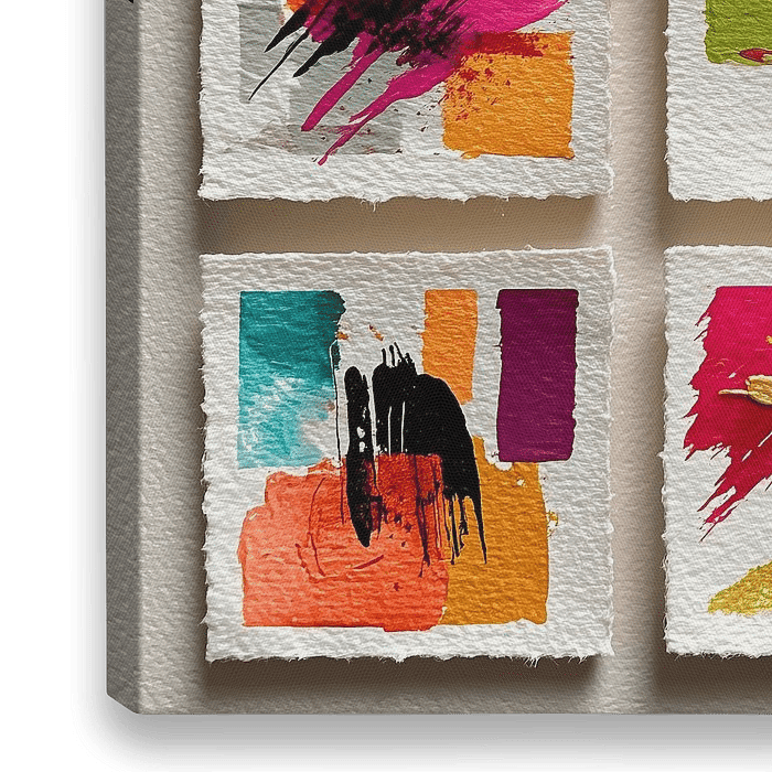 Ein Kunstwerk aus neun kleinen, abstrakten Aquarellbildern, die in drei Reihen angeordnet sind. Jedes Bild zeichnet sich durch leuchtende Farben, ausdrucksstarke Pinselstriche und unterschiedliche Texturen aus. Die Kunstwerke bilden eine lebendige, dynamische visuelle Komposition.