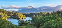 Ein bezauberndes Bild, das die ruhige Anmut des Lake Mangamahoe einfängt, während sich der majestätische Mount Taranaki im Hintergrund erhebt. Dieses Panorama bietet einen fesselnden Blick auf die malerische Symbiose von Berg und See in Neuseeland
