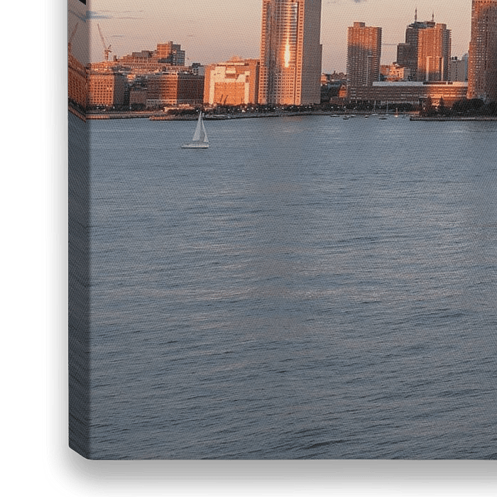 New York City Skyline während des Sonnenuntergangs schoss vom Wasser