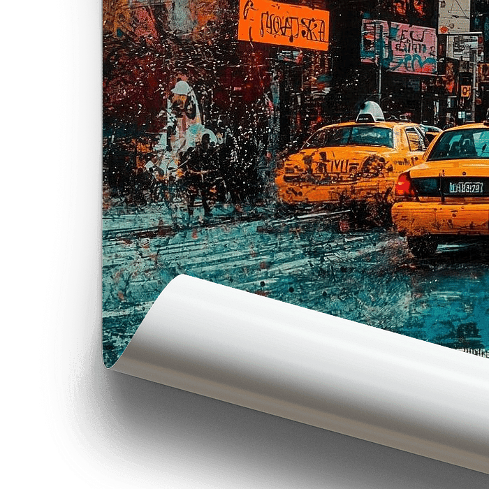 Ein ausdrucksstarkes urbanes Kunstwerk vom New Yorker Times Square mit ikonischen Taxis, Werbetafeln und farbenfrohen Graffitis strahlt pulsierende Energie aus. Eine Street-Art-Szene, die lebendige Dynamik und großstädtische Atmosphäre erzeugt und jedem Raum Charakter verleiht.
