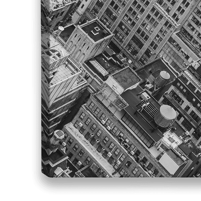 Blick vom Top of the Rock, der Aussichtsplattform des Rockefeller-Zentrums. Schwarzweißes Stadtbild mit viel Kontrast. Mit vielen typisch amerikanischen Wasserreservoirs auf den Dächern.